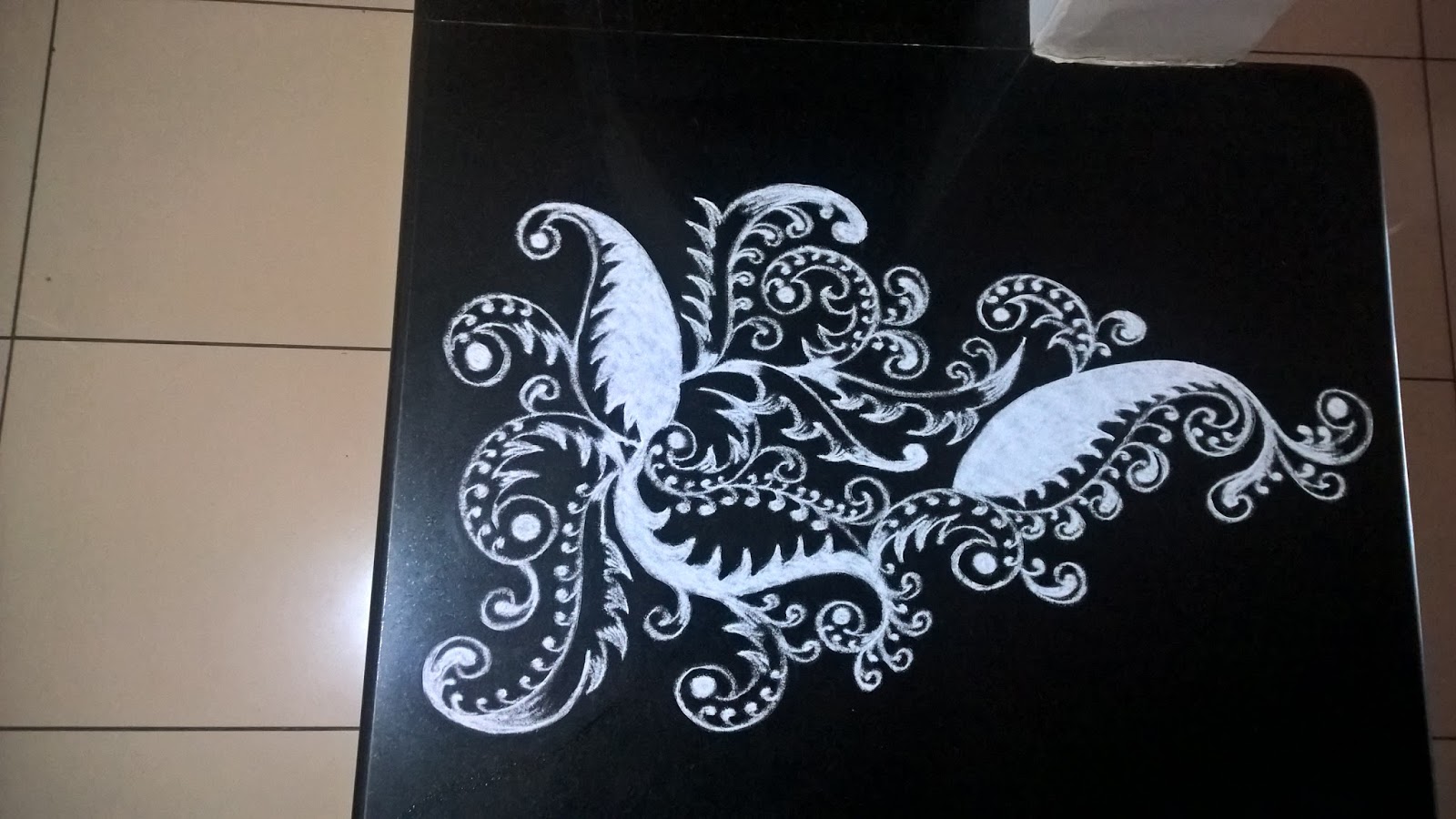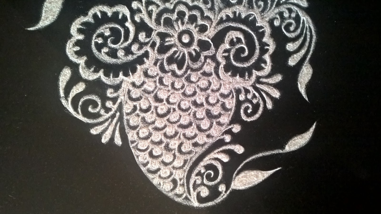 A fusion of Khokhloma painting (Russian wood painting handicraft style) and Norwegian Rosemaling (Decorative folk painting of Norway)......The latter uses a lot of scrollwork and stylised flowers..