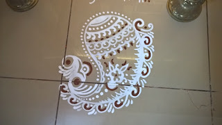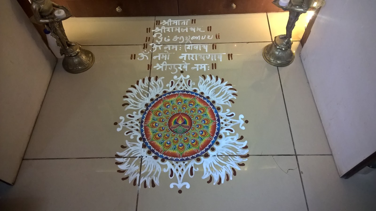 The diya kolam is one of my favourites.....loved the way the colours brighten up the kolam against the lighter coloured flooring....