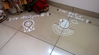 A morning ritual of the brightly colored one Her wet hair turbaned in white weave......In bright white on earth blackened by wetness, Many lines drawn, stretched from point to point By a hand and a gaze steady with purpose......Between the lines, dark empty spaces In triangles, squares and rounds; Opposites combine to calculatedly conceal Mysteries of the known and the unknown The seen and the hidden; an anubhava and a darshana......Some she fills with color, proposing desire; Some she leaves alone, for His disposed grace......Auspicious algorithms welcoming amplitude; And the ants that scattered return on cue to feed......Kolams !!!